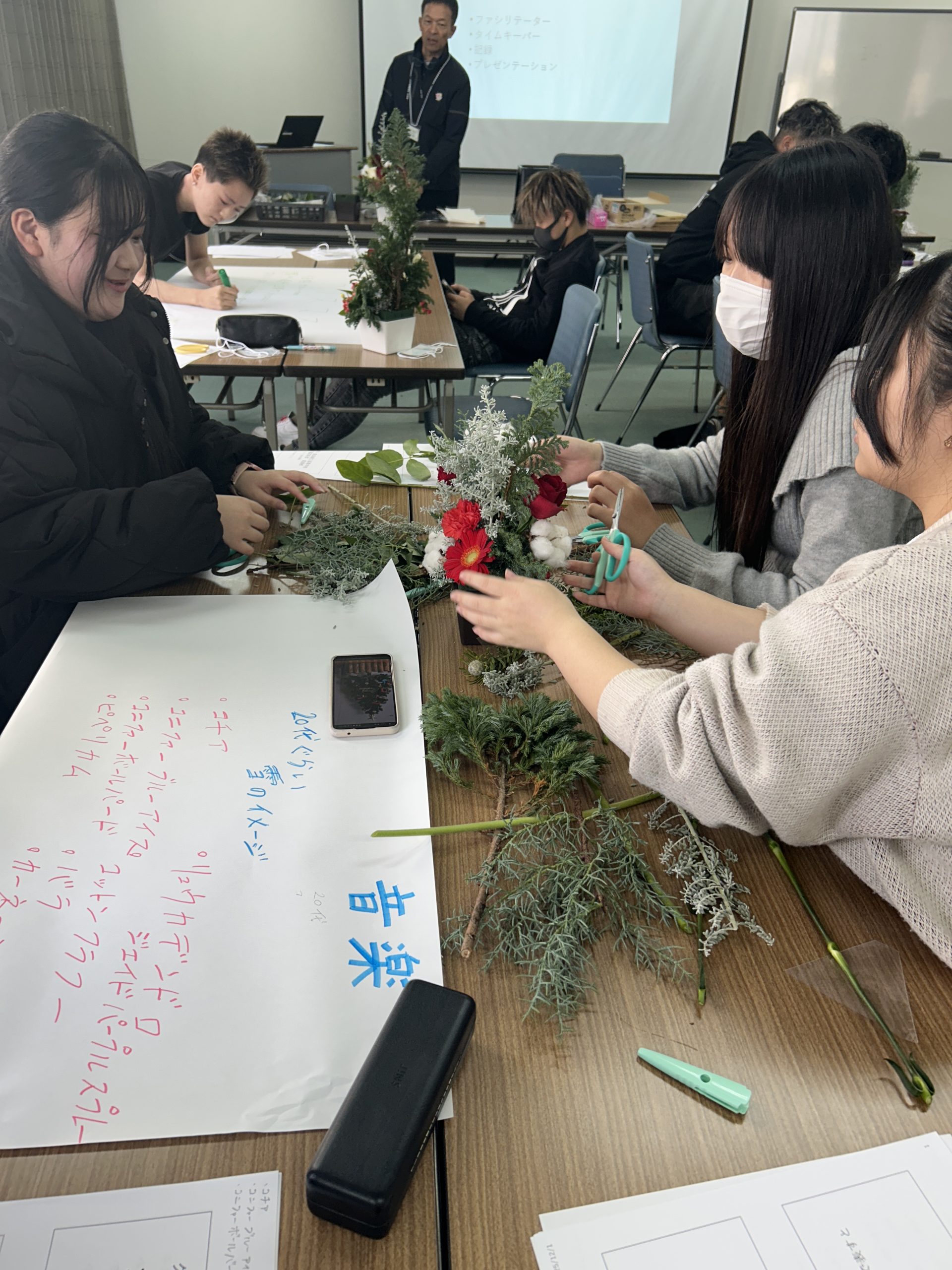 また、フラワーアレンジメントの体験を通して、チームで協力しながら一つの作品を作り上げる楽しさや難しさを学びました。完成した作品を前に、達成感と仲間との絆を感じることができたようです。
